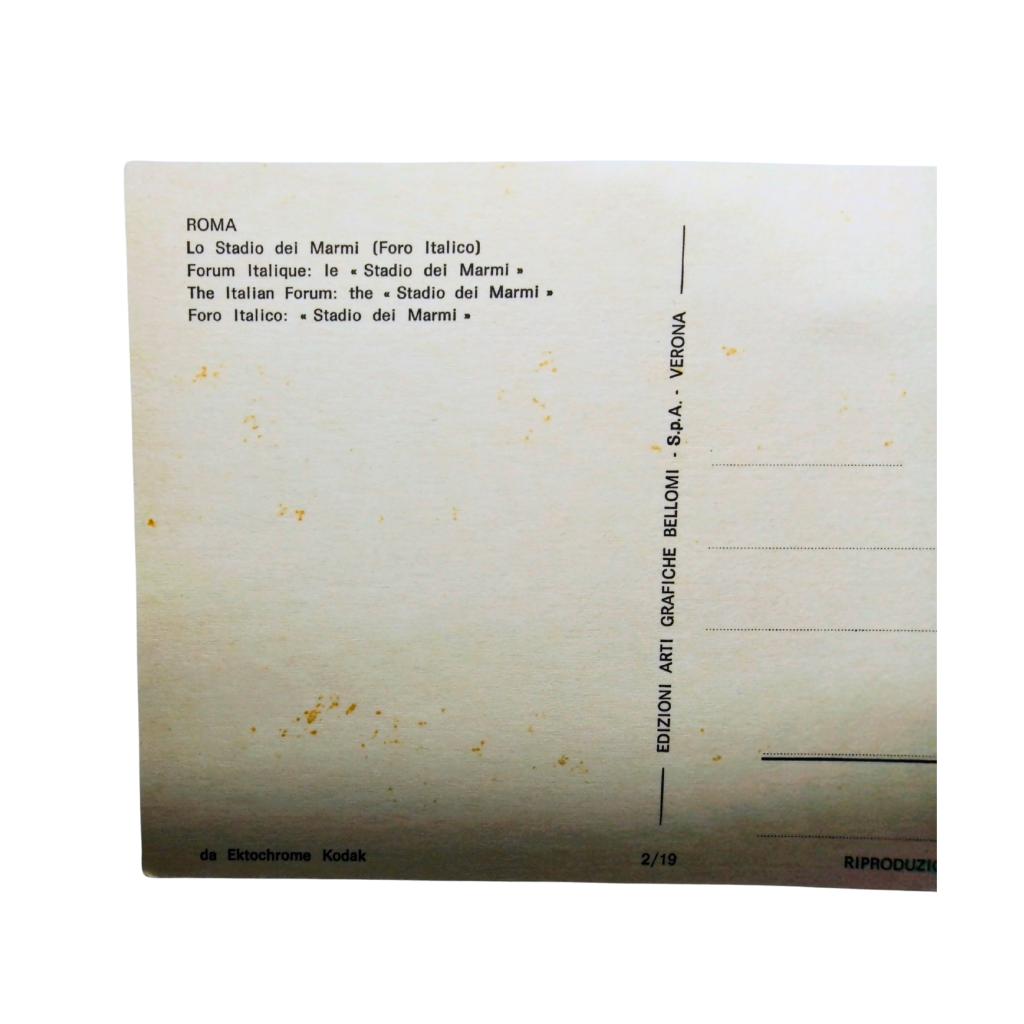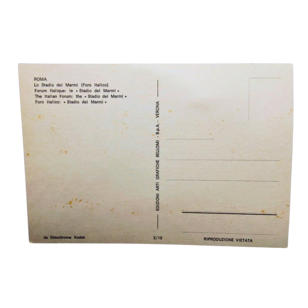 Splendida cartolina vintage che ritrae lo Stadio dei Marmi nel complesso del Foro Italico a Roma. Sullo sfondo è chiaramente visibile il Palazzo della Farnesina.