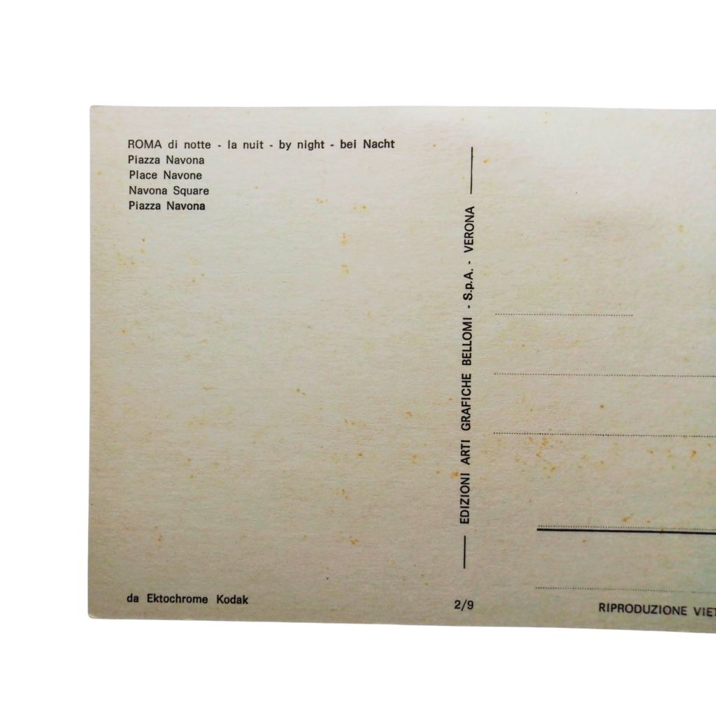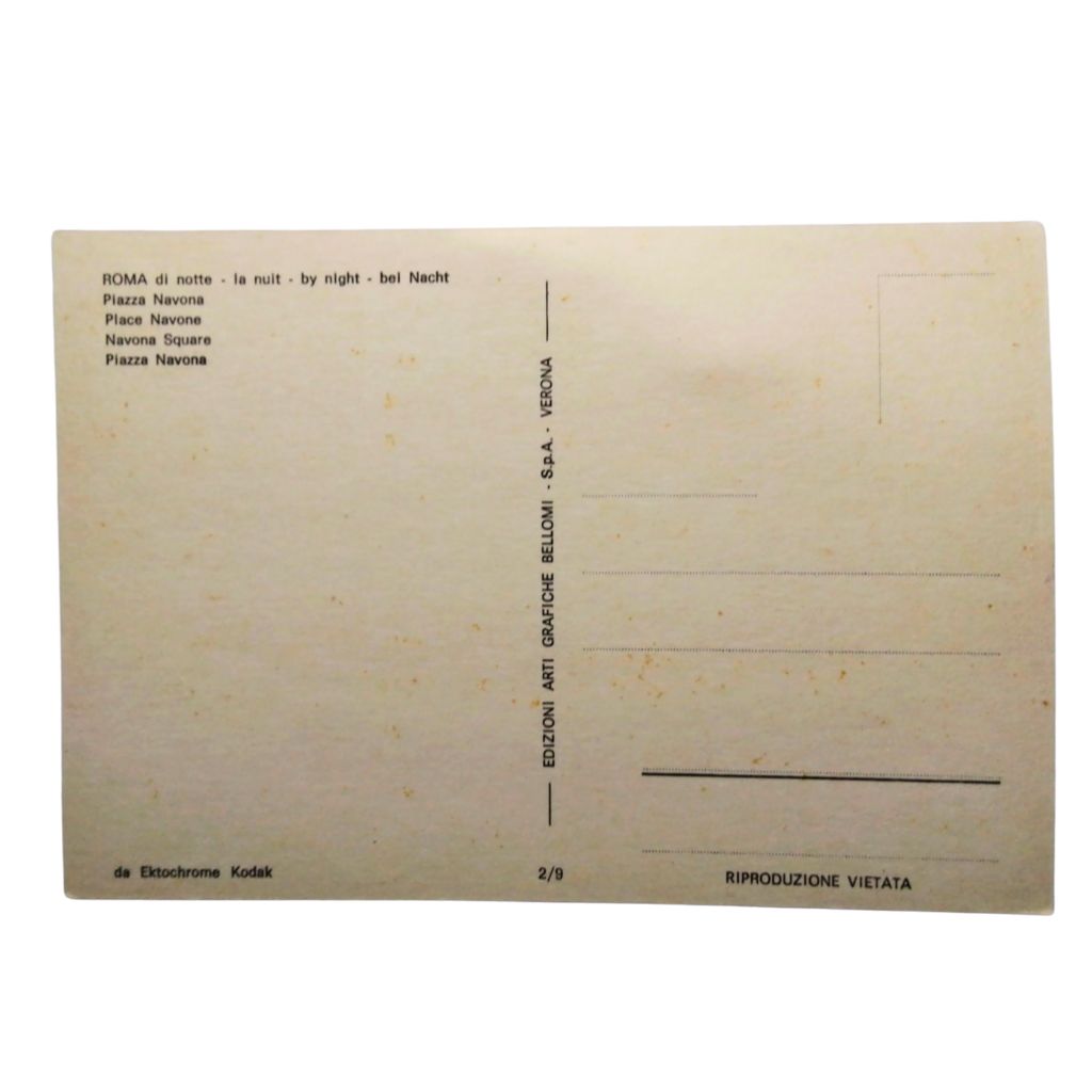 Splendida cartolina vintage originale della fine degli anni ’70 che ritrae la suggestiva Fontana del Moro in Piazza Navona, Roma, illuminata di notte.